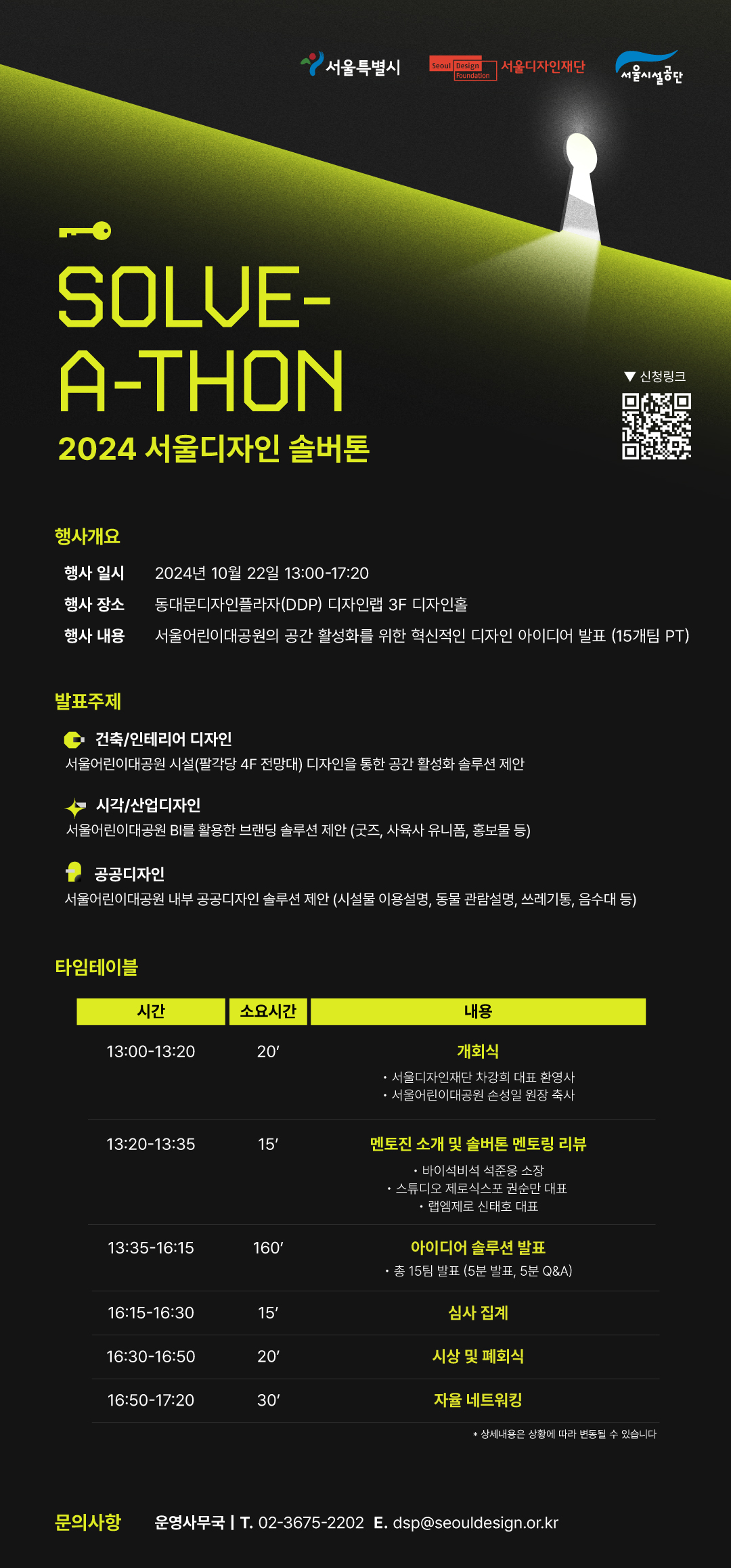 서울디자인재단은 10.22(화) 동대문디자인플라자에서 <제 1회 2024 서울디자인 솔버톤>을 개최합니다.심사를 거쳐 선발된 15개 팀 중 서울어린이대공원을 새롭게 변화시킬 최고의 디자인솔루션 아이디어를 선발하는 자리에 함께 해 주시길 바랍니다.※ 모든 청중에게는 국내최대 디자인 축제이자 MICE 행사인 서울디자인 2024 전시 티켓(12,000원 상당)이 제공되어 행사 직후 관람하실 수 있으며,