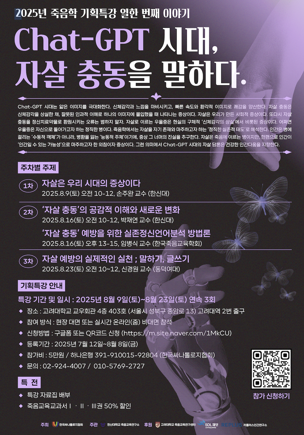 자살과 정신건강에 대한 사회적 관심이 그 어느 때보다 필요한 지금, 저희는 「2025년 죽음학 기획특강 – Chat-GPT 시대, 자살 충동을 말하다」를 준비하였습니다.