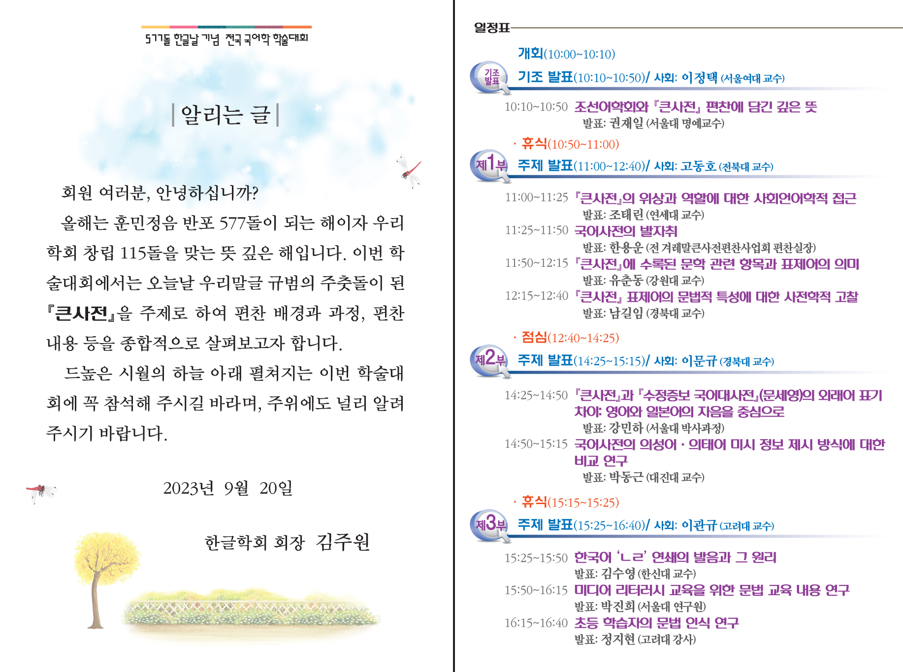 올해는 훈민정음 반포 577돌이 되는 해이자 우리 학회 창립 115돌을 맞는 뜻 깊은 해입니다